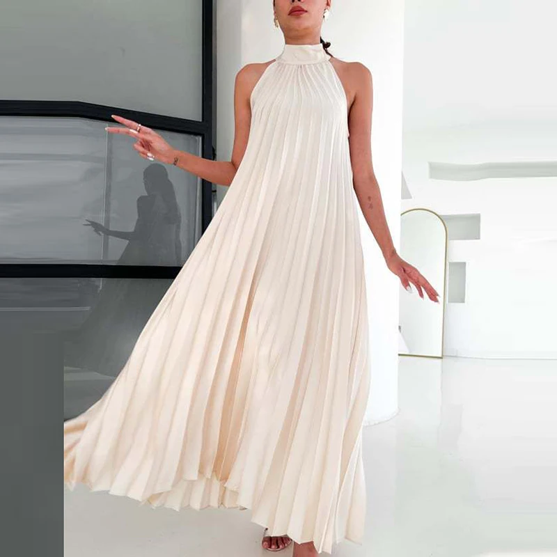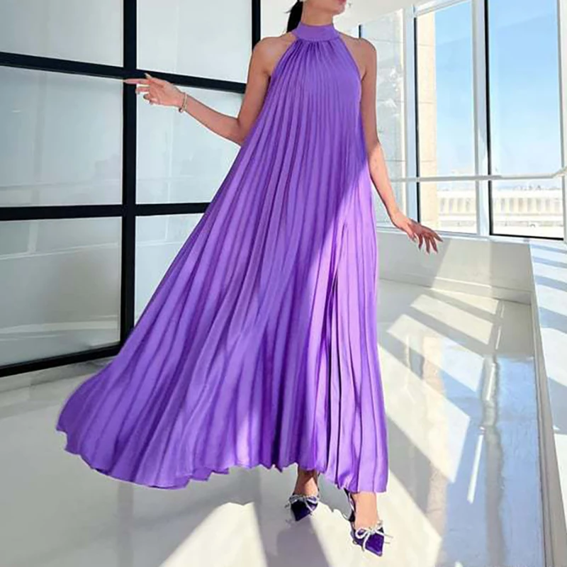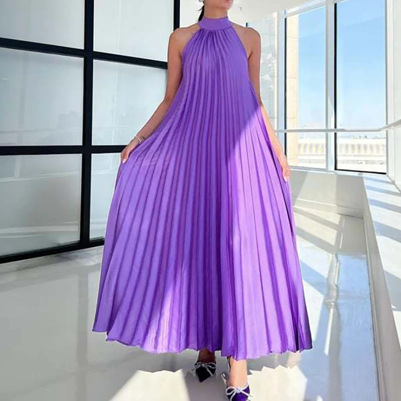 Spring Summer Half High Neck Loose Women Dress Casual Multi-color Pleated Long Dress 2025 Sexy Sleeveless High Waist Party Dress